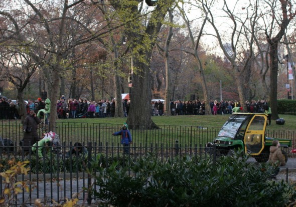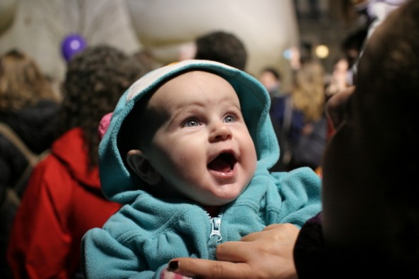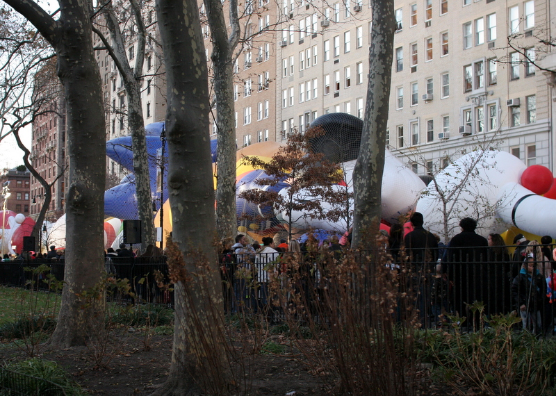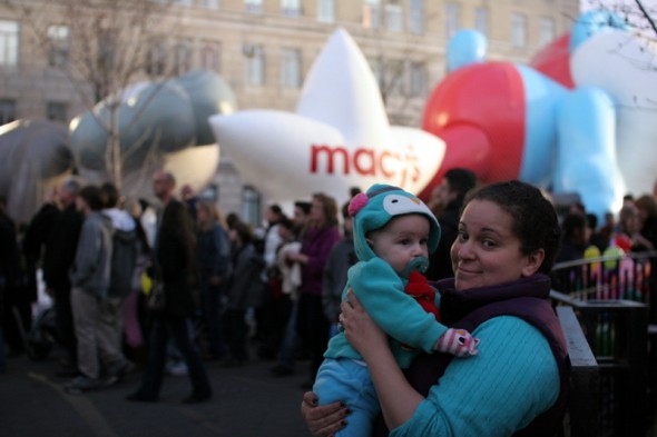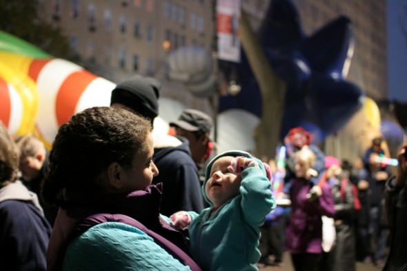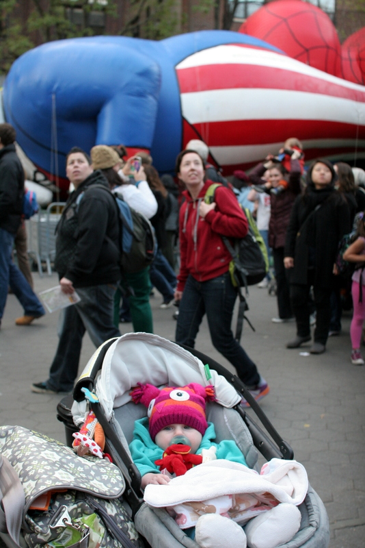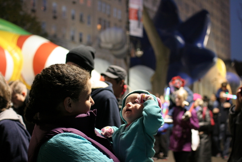 We kind of got going later than in past years. H and I were there by about 3:45, but Adam got held up at work and then rerouted out of the subway. So we didn’t meet up with him inside the perimeter of the inflation until after 4. By then it was getting dark and very crowded, so next year we’ll figure that out. But it was still so much fun, and H was so fun! She was just as interested in the crowds as the balloons, and it was amazing introducing her to this.