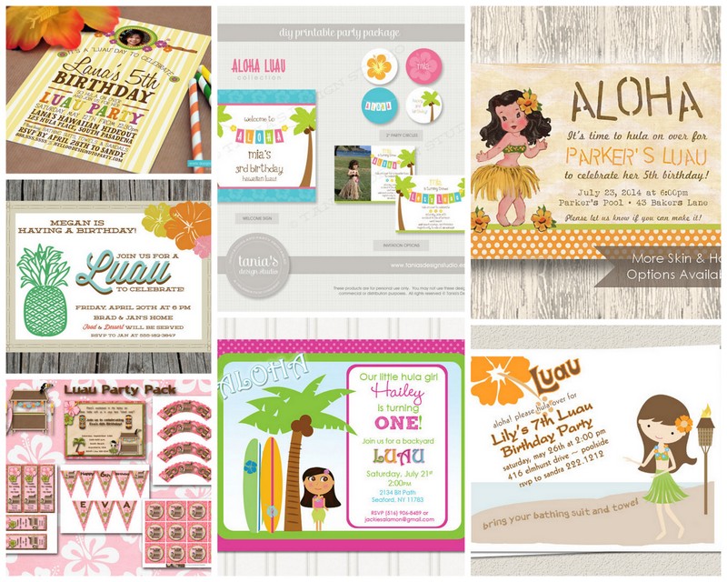 From top left, going clockwise: Luau Birthday Invitation from Design’d To Party; Aloha Luau Party Package from Tania’s Design Studio; Vintage Luau Invitation from Bee and Daisy; Luau Hawaiian Pool Party invite (it will not be a pool party) from Eclectic Note Cards; Hula Girl Invitations from Ginger Snaps Originals; Luau Party Pack from Decidedly Digital; and Retro Tiki Hawaii Printable from Print Your Heart Out.