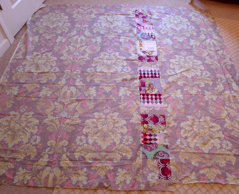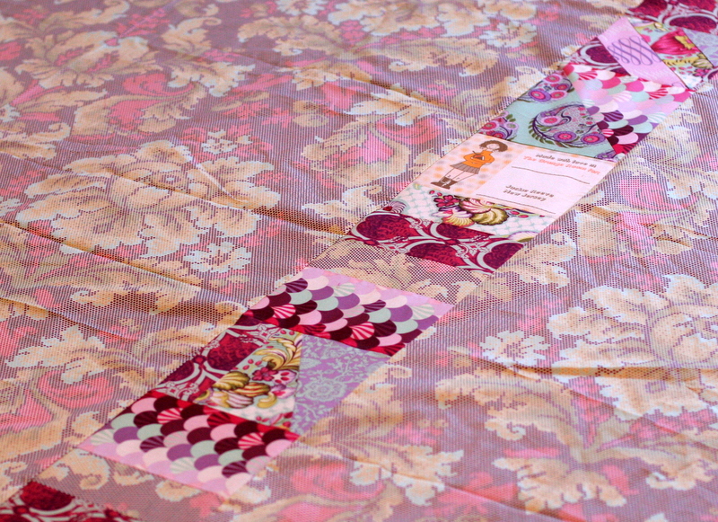 This was before I ironed and stretched the back out for my quilt sandwich, but I think you get the idea. I added a vertical, improvisationally-pieced strip with the label in it. And the rest is just one big print from the collection. I pieced a bit of the main print into the top and bottom of the label strip to make it look a little more interesting, almost like it’s floating within the backing. I love it.
