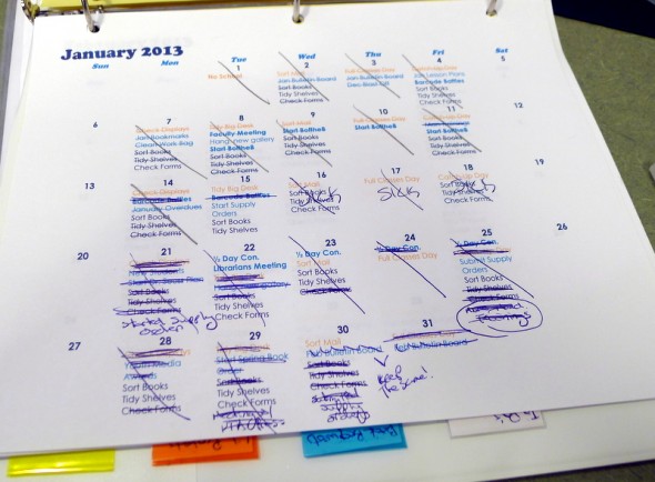 My work binder has the exact same principal, but a little more detailed. Big weekly tasks are in orange, everyday tasks in dark blue. But for work I’ve added light blue tasks that include meetings, self-imposed deadlines for things like changing bulletin boards and submitting orders. All of this is to try and give me a routine for running the library so I can easily keep up with the daily management of it all in addition to my class load. This work calendar has been kind of a lifesaver. I also included sections for work projects and a running list of book requests so I can easily log books I need to order.