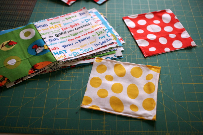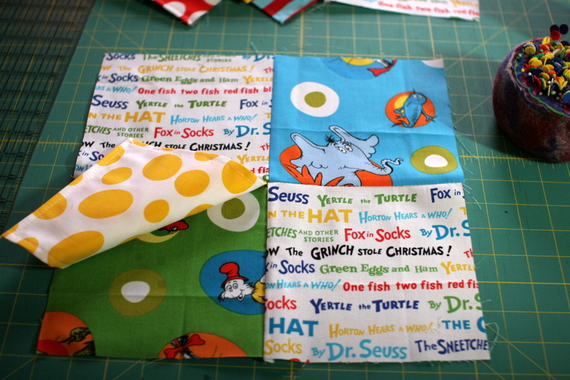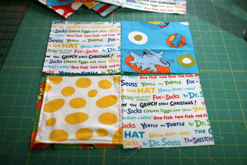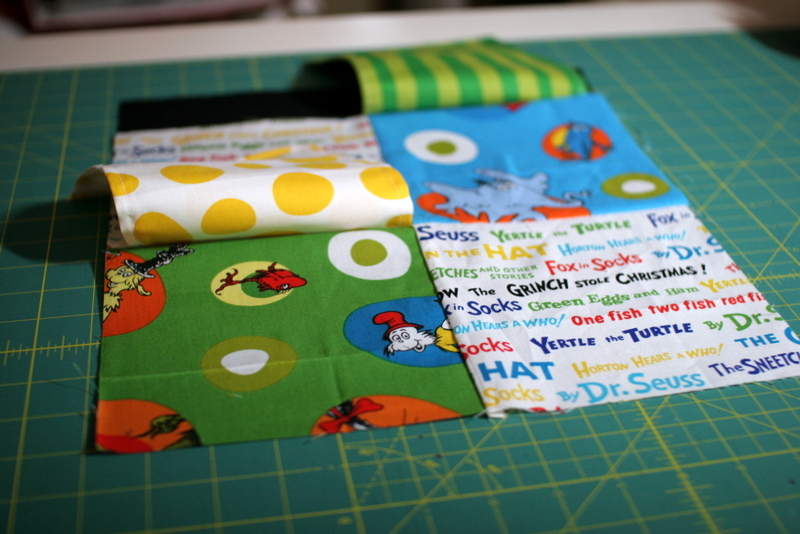 So I’ve had this Dr. Seuss fabric for a while now, at least a couple of years. I have 3 different collections of Dr. Seuss fabric and have never thought of a great project for them. But I’ve been working for weeks with the PTA on Read Across America projects for tomorrow, so I’ve had Dr. Seuss on the brain. It was time to make H a new play quilt (she’s been taking this one to her sitter’s all year) and I thought a lift-the-flap quilt would be really cool for her at this age. So I’ve been inspired, and I thought it would be a fun quilt to work on leading up to her first birthday.