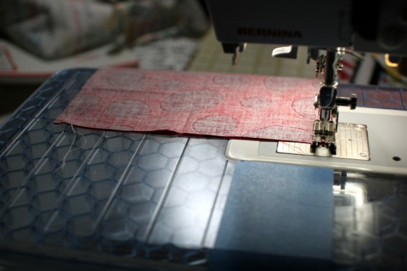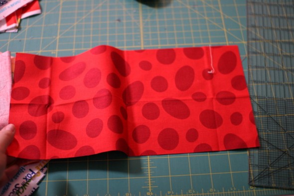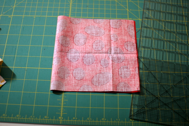 To make the flaps, I folded fat quarters in half and cut 6.5″ squares on the fold.