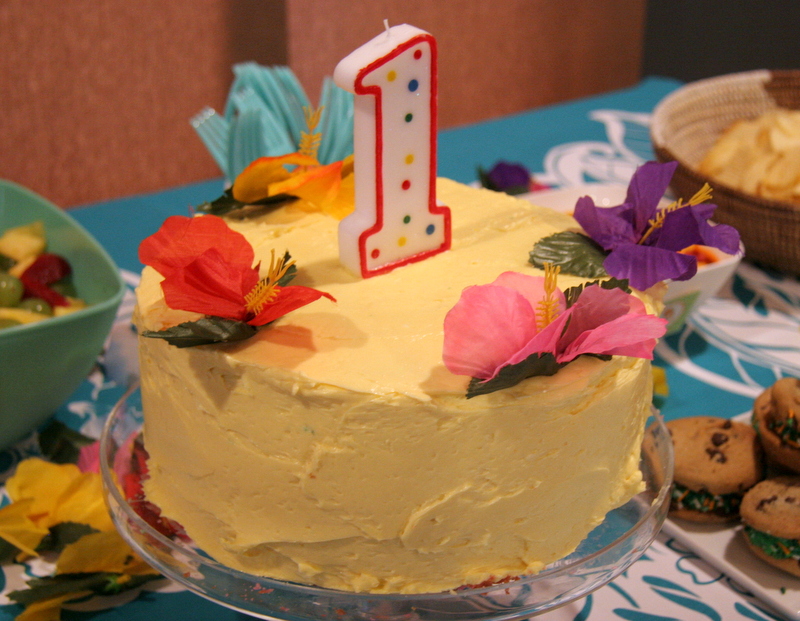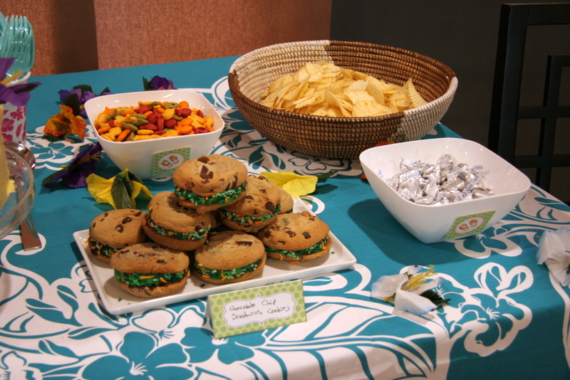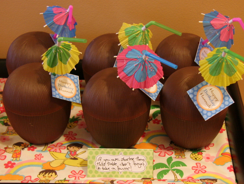 I loved the favors. I bought everything from Amazon (we would be lost without our Prime membership). The coconut cups each have a little Hawaiian rubber duck and a small baggy of Color My Bath! tablets. I bought a container of 300 and split them up. We now have tons of luau straws with hula girls, umbrellas, toucans. Summer cookouts, here we come.