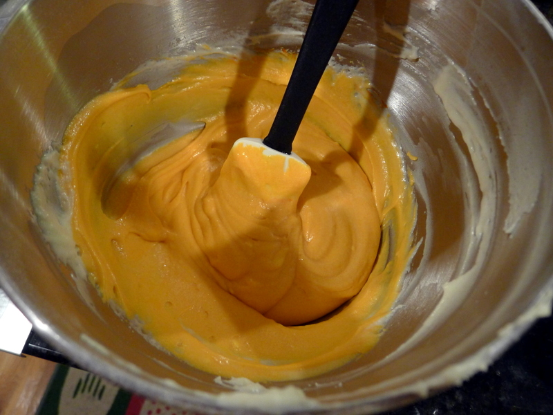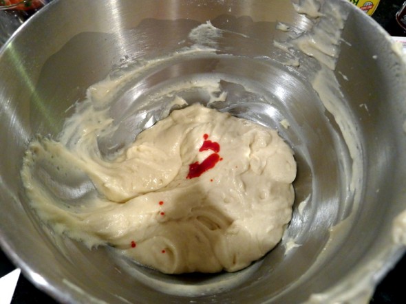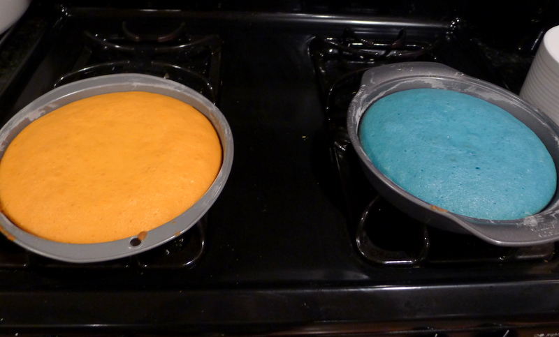 The cake recipe was from my trusty America’s Test Kitchen Family Baking Book. I specifically wanted white cake, not yellow cake, because I wanted to make sure the dyes would be bright and vibrant and not altered too much by the color of the cake batter. Now my white cake recipe was for a 2-layer cake, so I actually made 2 batches because I wanted this to be nice and high. Here’s the original recipe, with my food coloring modifications and no almond extract (in the original recipe, but why sully a perfectly good cake with almond extract?):