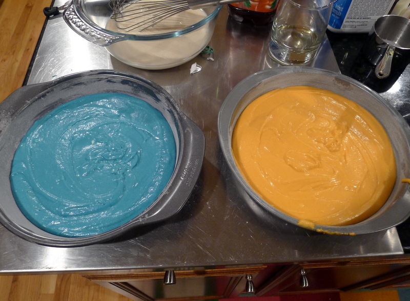 I figured out that each layer of this particular cake recipe was about 3 cups of batter (very messy trial and error). I can’t speak to other recipes, but if you use this one you should be good to go with 3 cups of batter to a layer. So with each batch I made, I portioned out 3 cups of batter into separate bowls for coloring. I used my good Ateco food coloring gels, which get more saturation with less dye than supermarket food coloring. And I have the entire range of colors, so I don’t have to mix. I never use any other food coloring, these are wicked good to keep on hand (sorry, we just got back from New England).