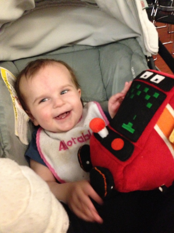 On Sunday H and I went to the Geek Parenting panel, and she won this stuffed arcade game as a prize. She would not put it down the rest of the trip.