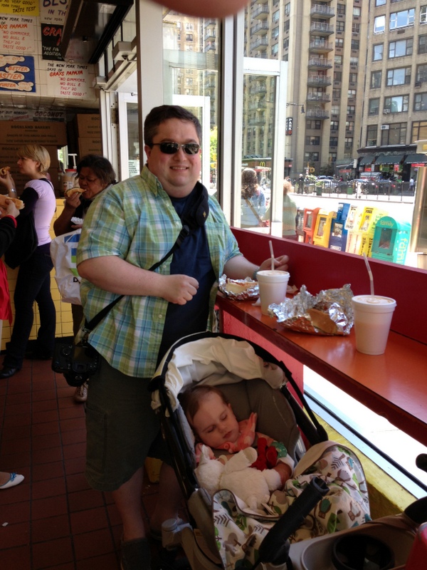 Adam hates when I put photos of him on here, but he was a huge part of why today was killer. So I’m breaking the rule today. This October will mark a decade since he moved here from the UK, and somehow in nearly 10 years I had never gotten him to a Gray’s Papaya. We don’t even know how that happened, but today I was inspired to fix that. Inspiration was rewarded with a happily napping baby and an empty counter. And hot dogs.