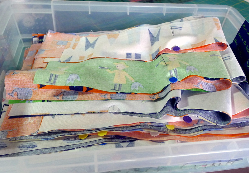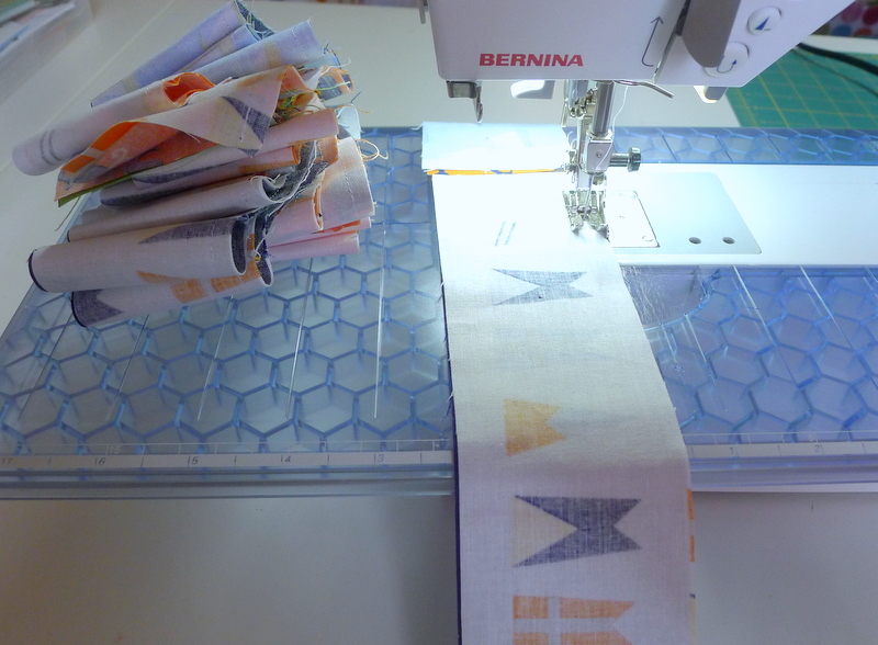 They have all been ironed with seams facing the same direction, and I have pinned those 72 pairs together again to make 36 sets of 4 strips. And I’ll go on and on that way until my columns are ready and can be joined.