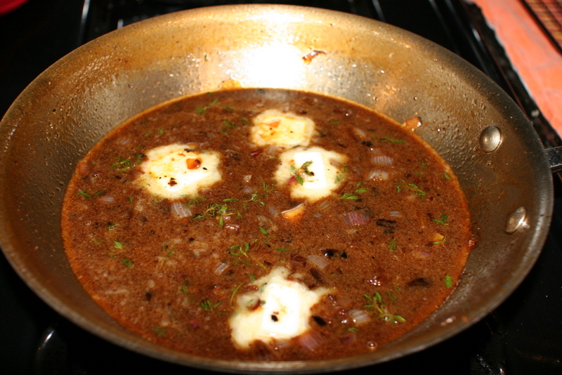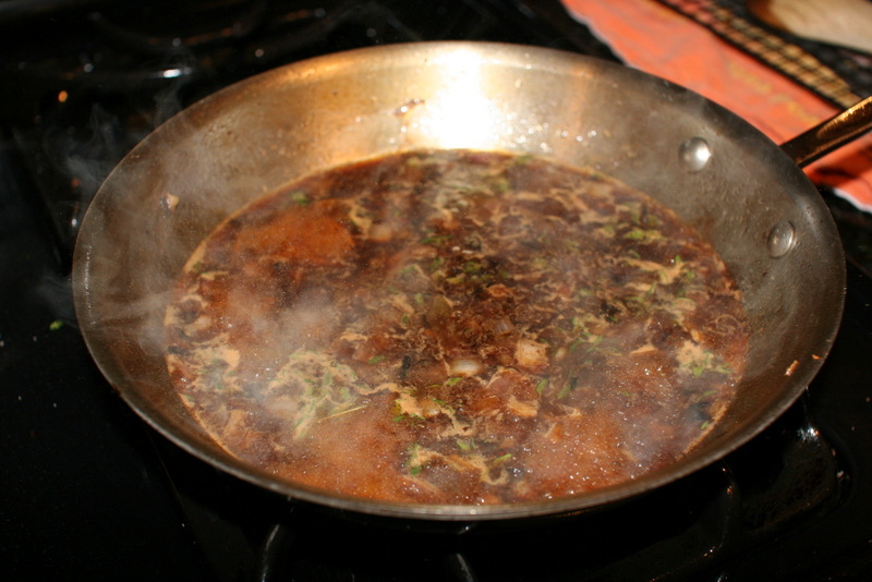 “The browned bits left in the pan after cooking the steak tips are essential for this recipe and give complex flavor to the pan sauce. To release them, deglaze the pan with a combination of wine and broth”