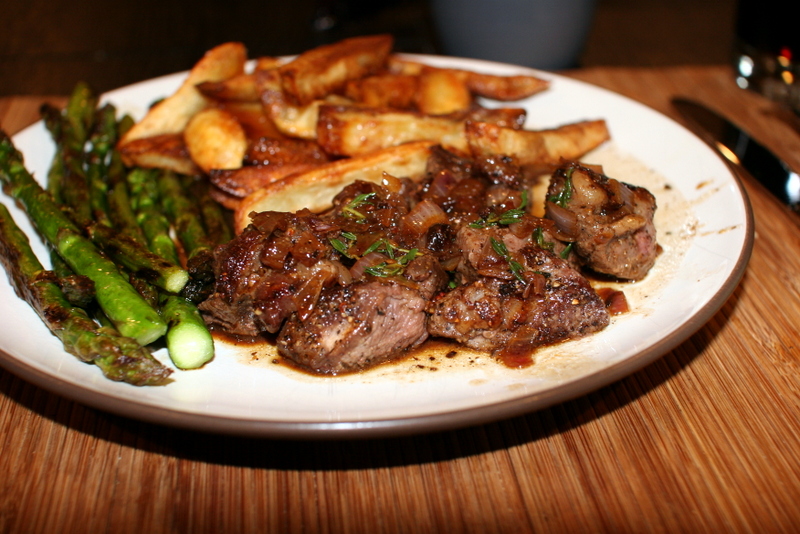 I made this yummy, surprisingly straightforward dinner a while back (and added some asparagus to the mix). I love Steak au Poivre, or really anything peppery. The tips were nice for a weeknight when you don’t necessarily want an entire steak. I bought one nice sirloin steak, and it was more than enough to feed us both.