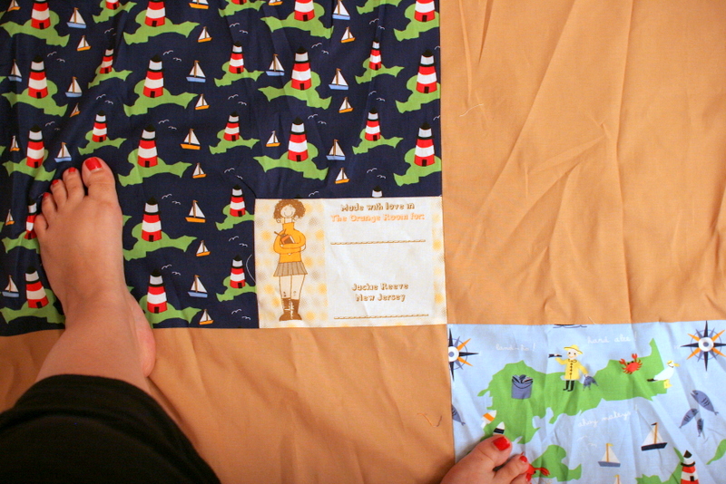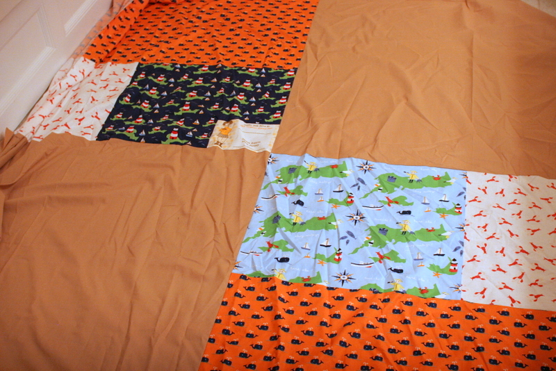Man, this is so wrinkly. I basically made a 4 patch using solid khaki fabric and pieced sections of my remaining All Hands on Deck.