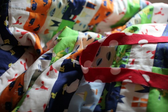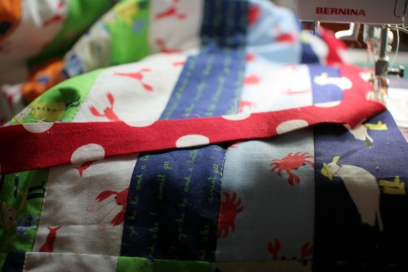 The quilting is all finished on this, and I’m putting on the binding right now. Then, I’ll just have to wash this and try it out. Here’s hoping for some nice beach weather tomorrow!