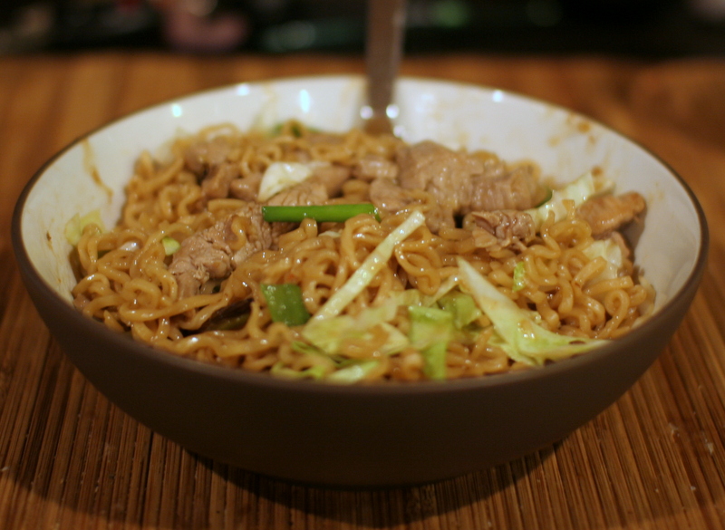 I made this back in the spring, and it was heavenly on a cool night. Not soup, lighter than a bowl of pasta, and more substantial than a stir fry. It was in my Best Skillet Recipes cookbook and the Skillet Dinners 2013 publication from Cook’s Country. There were recipes for a few different ramen noodle suppers. I’ve also made the Beef and Spinach Ramen, but that’s for another day (when I make it again, and actually take pictures). This bowl of pork and noodles and veggies is just good-for-the-soul food. And made with a pantry staple I lived on in college.
