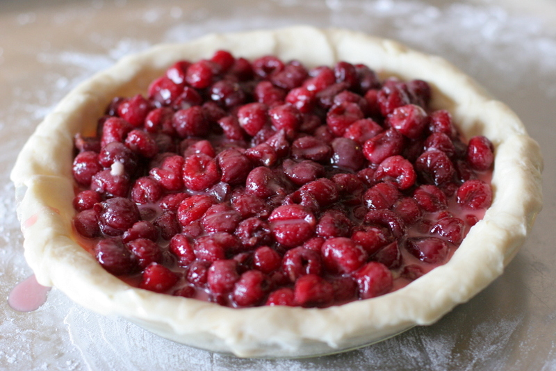 I ended up pitting and freezing all those gorgeous sour cherries we picked up a couple of weeks ago. I didn’t make a pie that weekend, so I wanted to save them for July 4th. My family was over again yesterday, and while it wasn’t quite the holiday we were expecting (my brother was in the ER, H had a slight fever) we made the most of it and ate plenty of food (my mom made mac ‘n cheese!). Including this, my first real sour cherry pie.