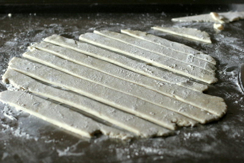 Roll remaining disk pate brisee to a 1/8-inch thickness on a lightly floured surface. **I strayed from the original recipe at this point, and I cut my dough into roughly 1″ strips to make a lattice for the pie.