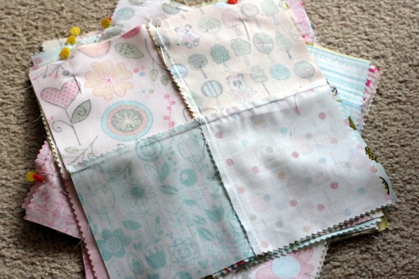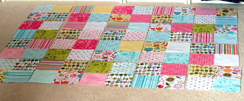 So I finished sewing together all my 4-patch blocks, and I’ve arranged them the way I want them. I started with 5″ squares, and now my blocks measure 9.5″ square. I have twenty blocks ready to be pieced together for the top.