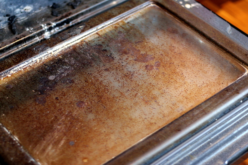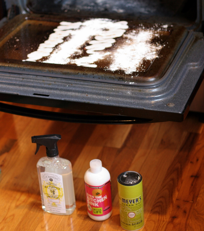 I decided that my diabolically filthy oven would be a good test of the power of the green clean. If a natural cleaner could conquer that, it could probably do anything. Let’s just say that in the 5+ years we have lived in this house with this oven, I’ve cleaned it exactly zero times. I mean, I’ve wiped up pie drippings and cheesy toppings from the oven floor, but I haven’t stuck my head in there to really scrub it into submission. Another reason for the green cleaners; I knew the job would take hours (4 solid scrubbing hours, in the end), and I did not want to inhale toxic fumes all day.