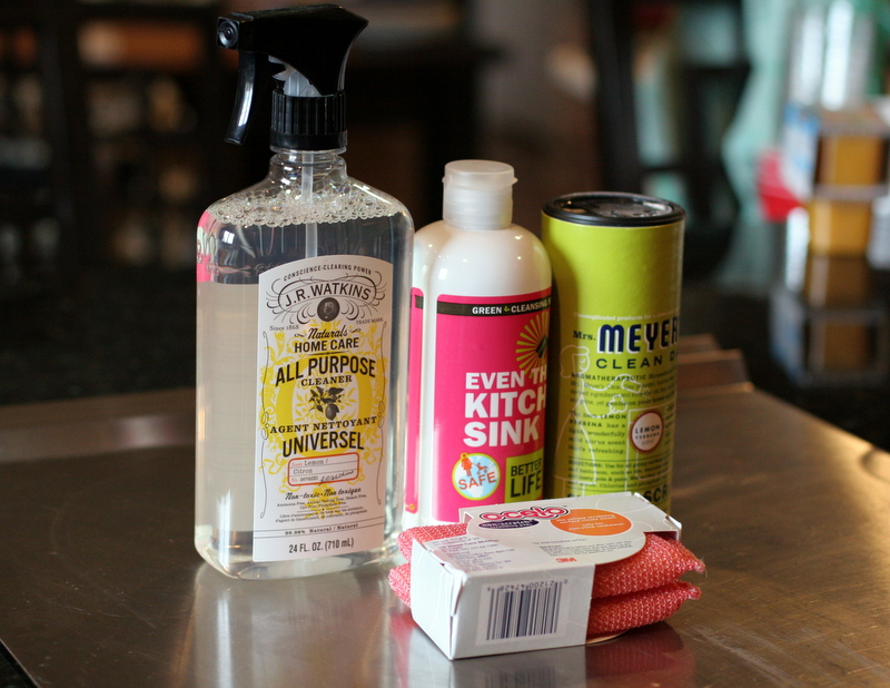 I used J.R. Watkins All Naturals spray cleaner, which I’d been using for everyday counter top wipe downs. Then I alternated drizzle/sprinkles of Better Life’s Even the Kitchen Sink gentle scrub and Mrs. Meyers Clean Day Surface Scrub powder.