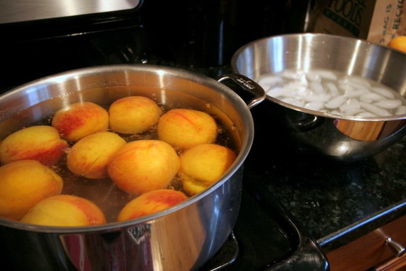 To peel the peaches I followed the book’s tips: Score the peaches with an “X” at the bottom. Put the peaches in boiling water and simmer for 30-60 seconds, until the skins start to loosen. Transfer the peaches to an ice water bath immediately and let them cool for about a minute. Then use a paring knife (or your fingers) to peel off the skins. You will get messy, but it works.