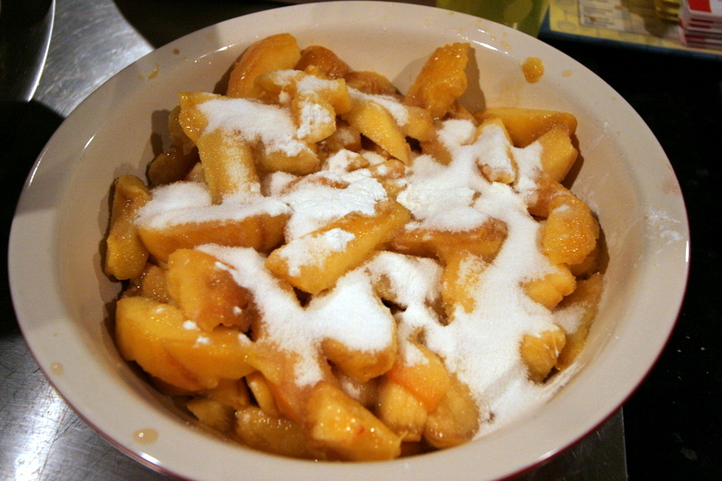Make the pie filling: Pit and slice the peaches, then combine them in your pie dish with all of the other filling ingredients.