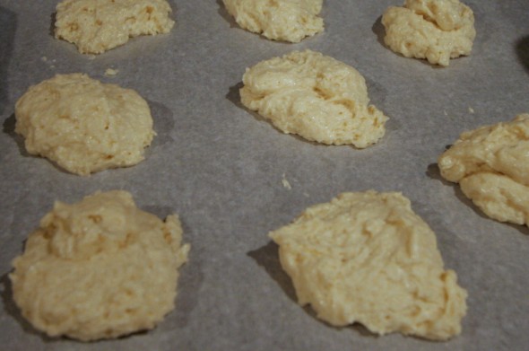 Using a greased 1/4 cup measuring cup, scoop out and make 8 mounds of dough on a parchment paper-lined baking sheet.