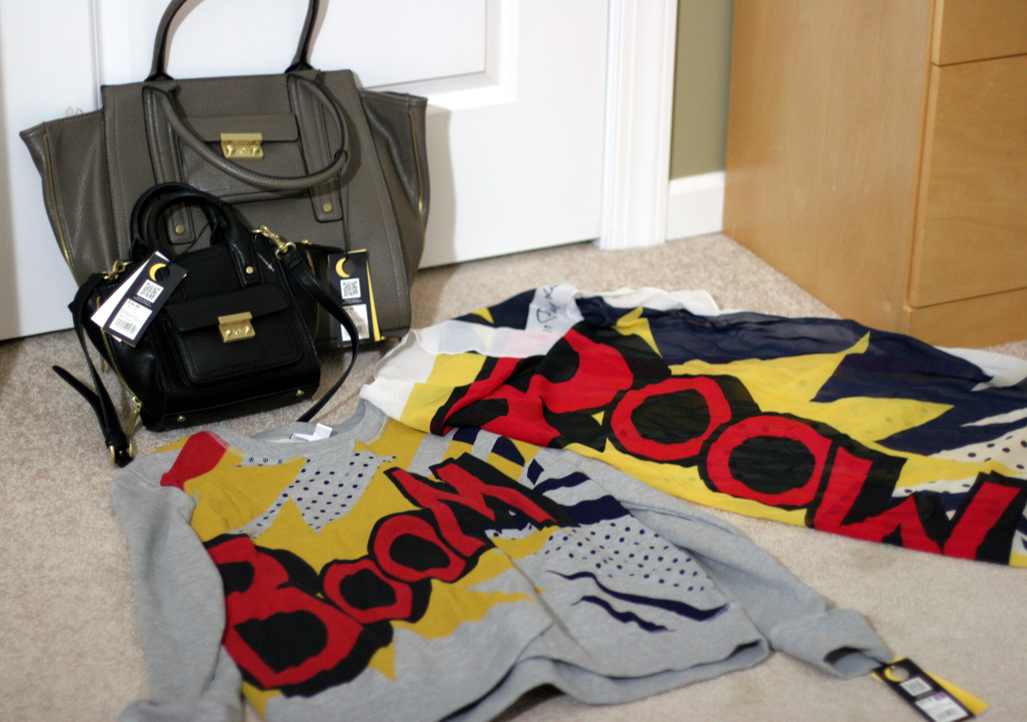So I was able to get the BOOM sweatshirt and the BOOM scarf (last one), both of which are adorable. I was really surprised that no one was going after the sweatshirts; there was a mom there picking out things for her college-age daughters, and I pointed her to the rack of sweatshirts. I mean, Lim’s Ka-Pow top is so well known I thought this would be the item I’d be fighting for. And it was one of the main things on my list, I picked it up with no problems.