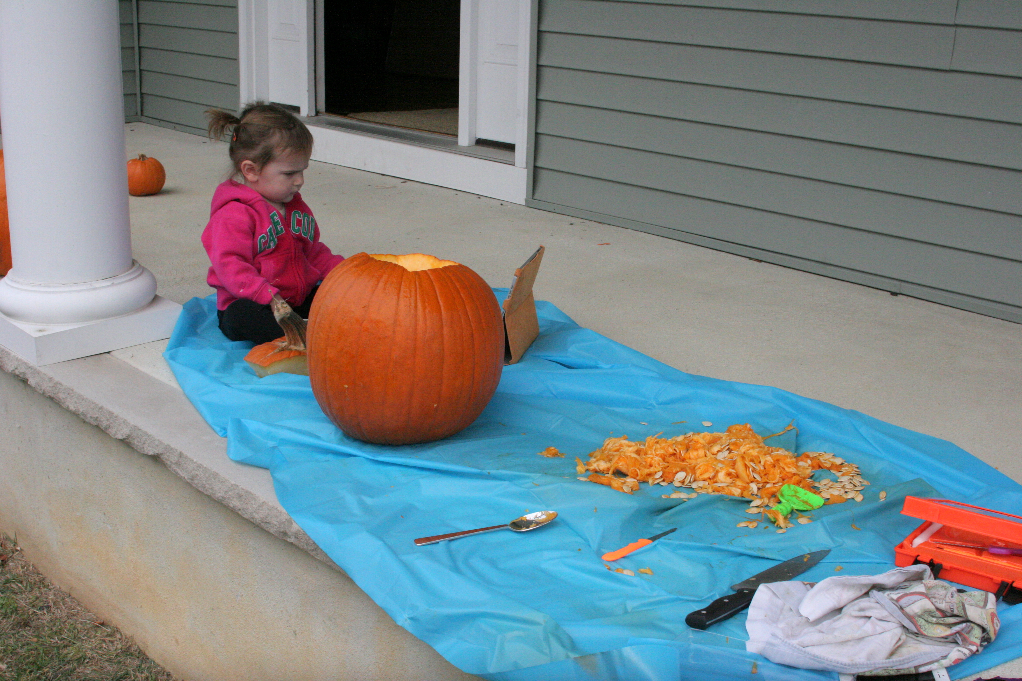 She was totally icked out by the pumpkin innards (understandably). She was much more interested in my iPad and the Pinterest inspiration I was looking at. I even tried to put one of her movies on to keep her excited about hanging out, but it was too bright out there for her to see it. Eventually she just got up and went in the house to play, leaving me by myself! I thought I had years to go before that started happening.
