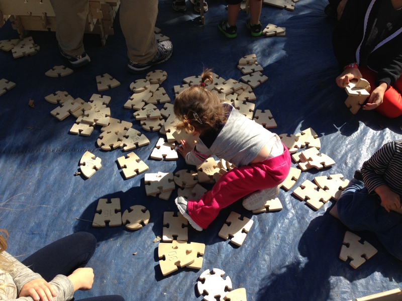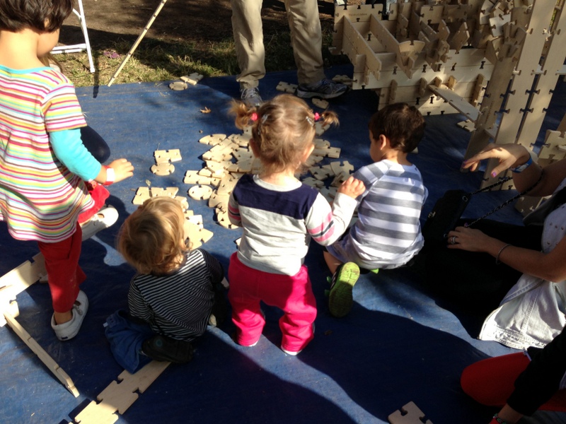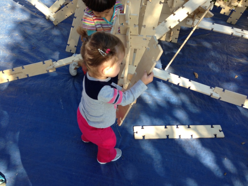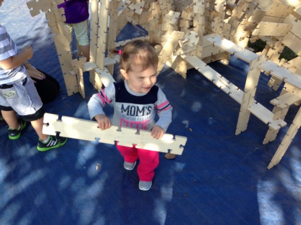 Thinker Linkers are one of the big things on our holiday radar this year. We took H to Maker Faire New York last month, and these full-size wooden building sets were out for kids to play with. She immediately took to them and dove right in with the older kids, picking up planks and trying to get in on the innovation. She was so enthusiastic that some of the older kids started an alliance, with a boy taking charge and warning the other kids not to let H near the structures they were building (she does have a penchant for destruction, but she just wanted to play).