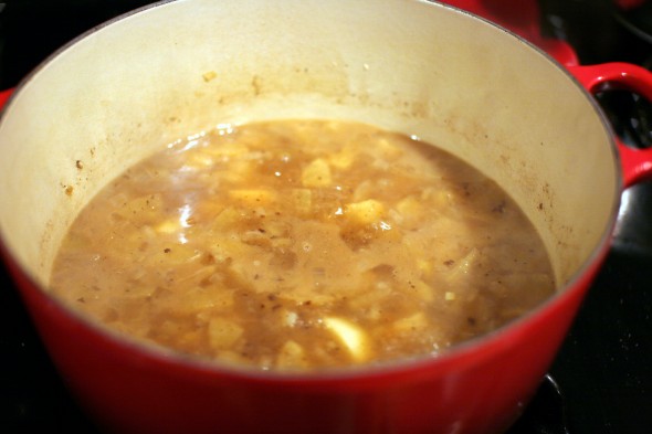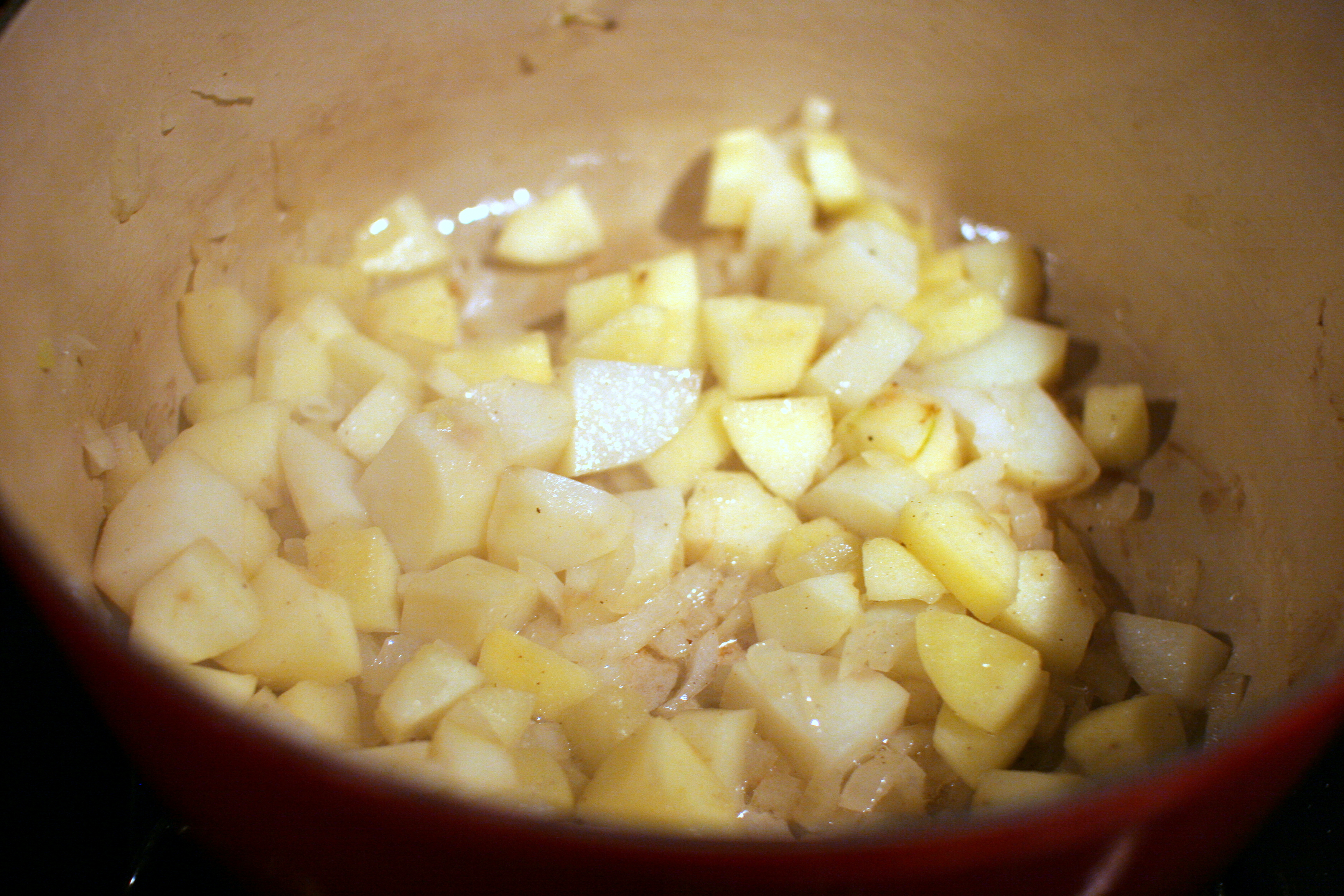Increase the heat under the pot to medium high. Add the onion, apples and potato and cook, stirring frequently, until the apples are soft, about 8 minutes.