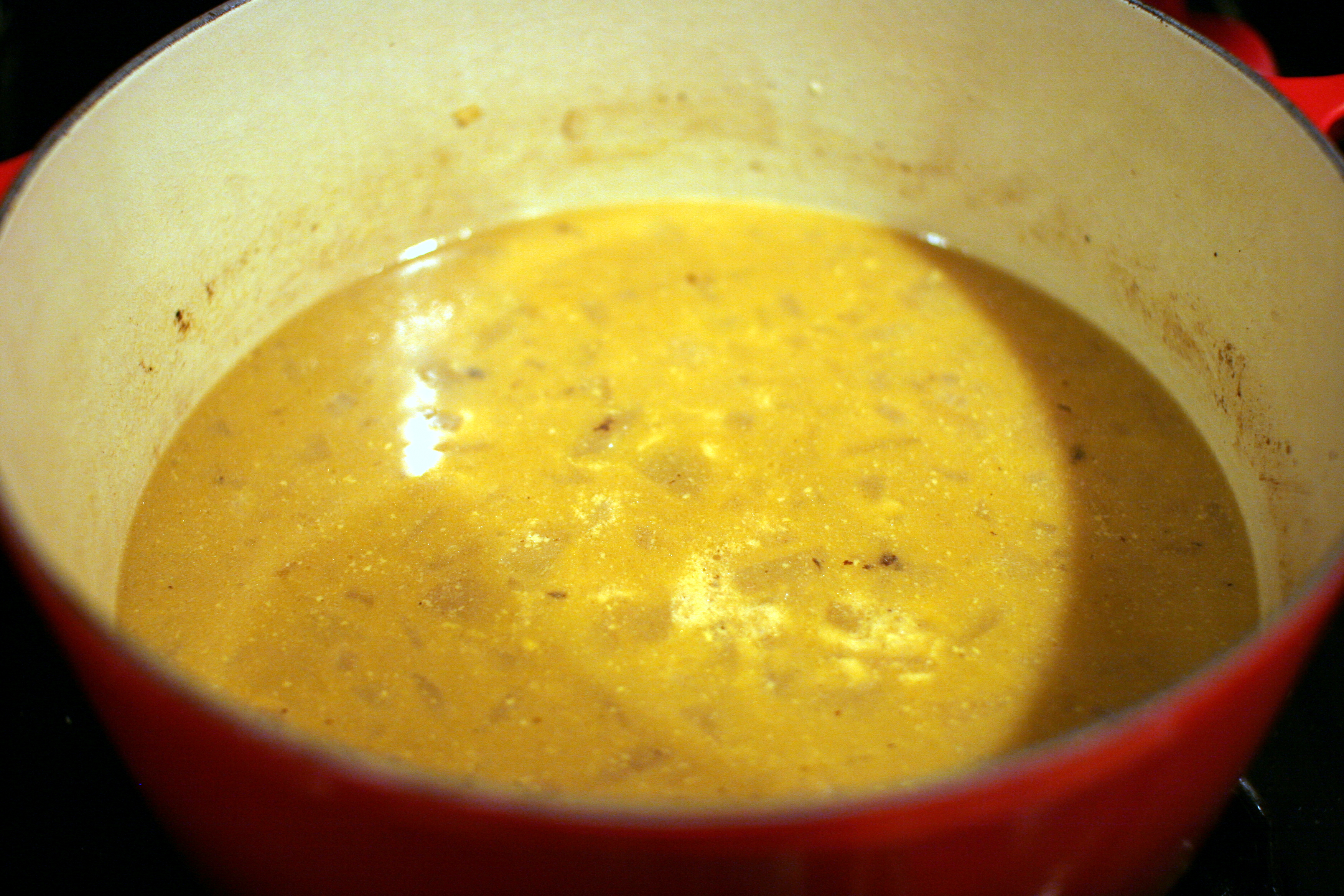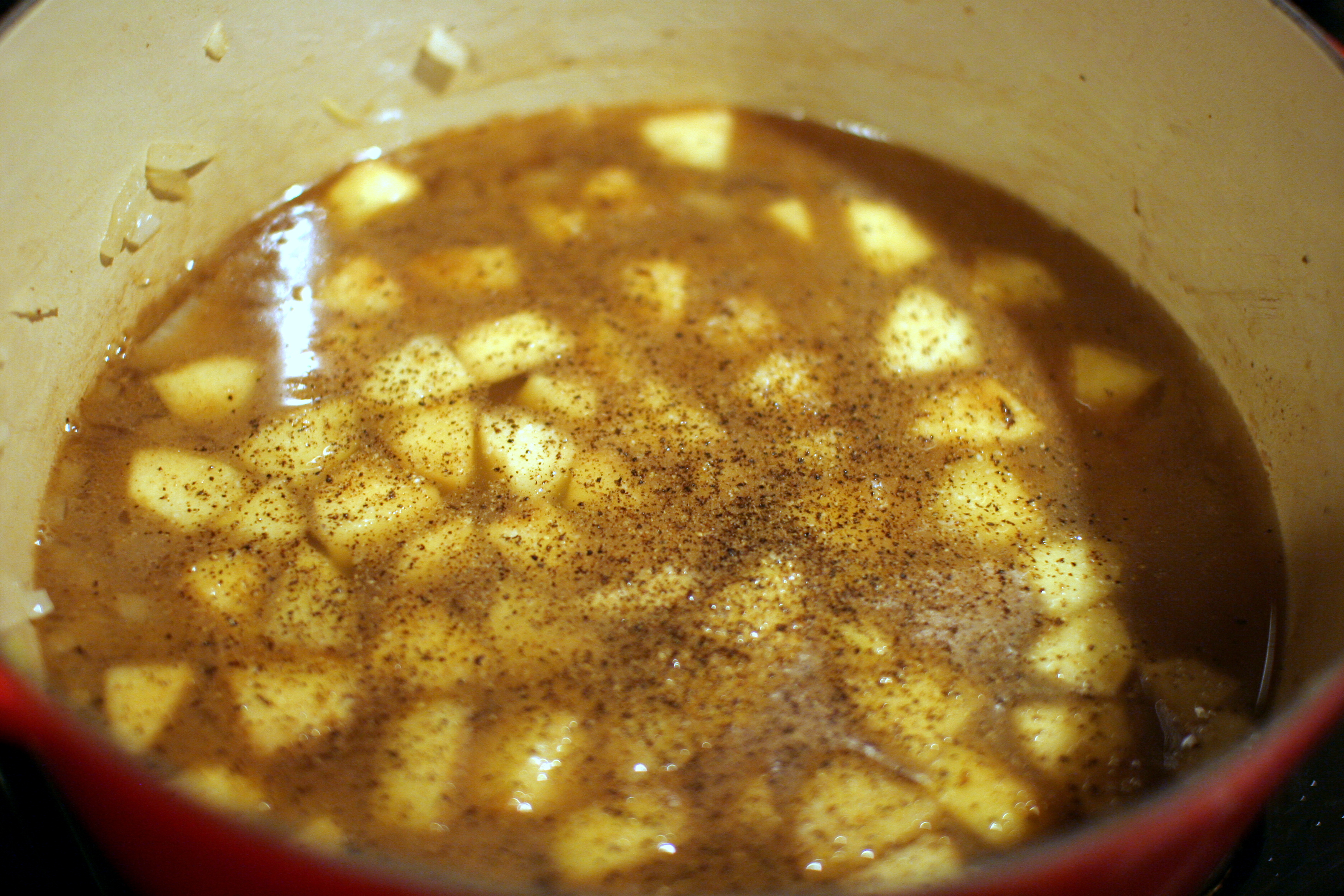 Add the chicken broth, apple juice, 3/4 teaspoon salt, and pepper to taste.