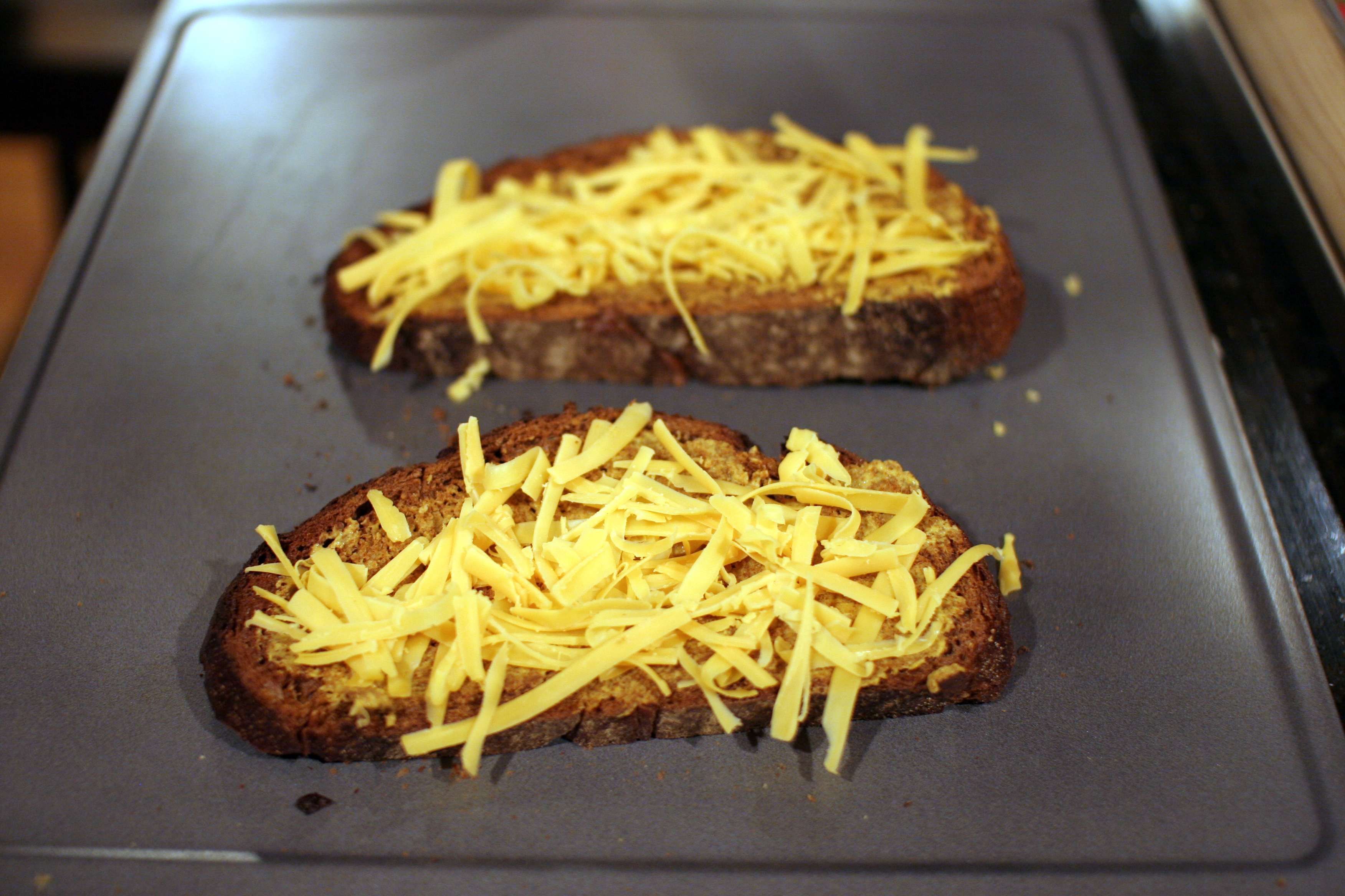 Meanwhile, preheat the broiler. Spread the bread with the mustard and sprinkle with the reserved 2 tablespoons cheese.