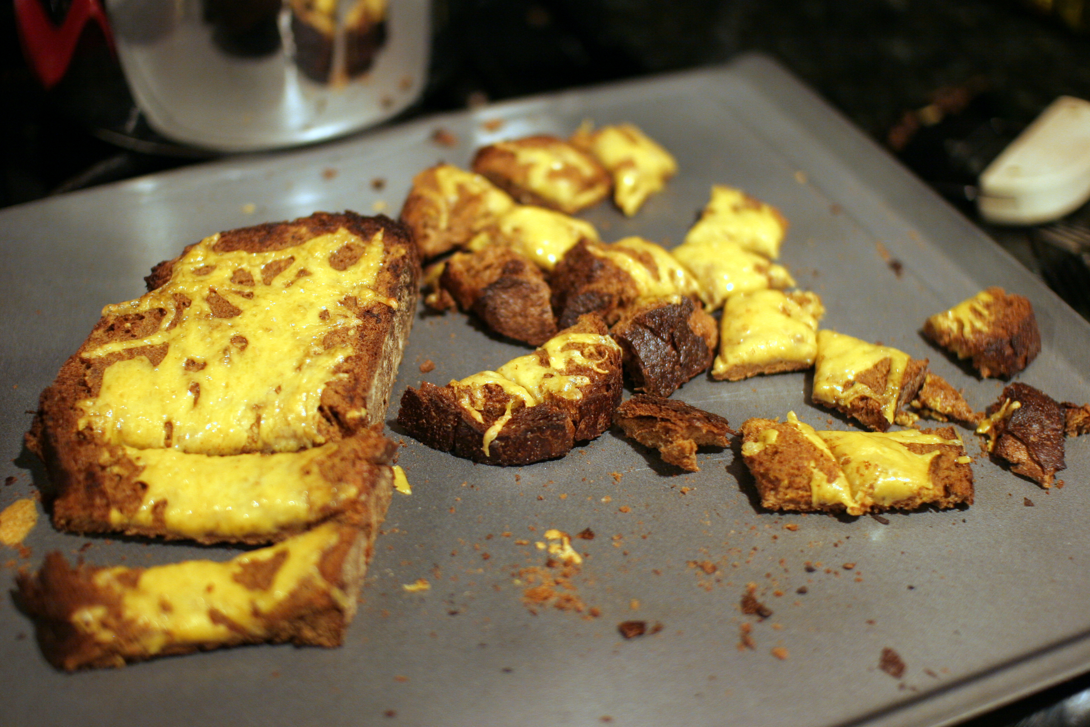 Broil until the cheese melts, about 30 seconds, then cut into 1-inch squares.