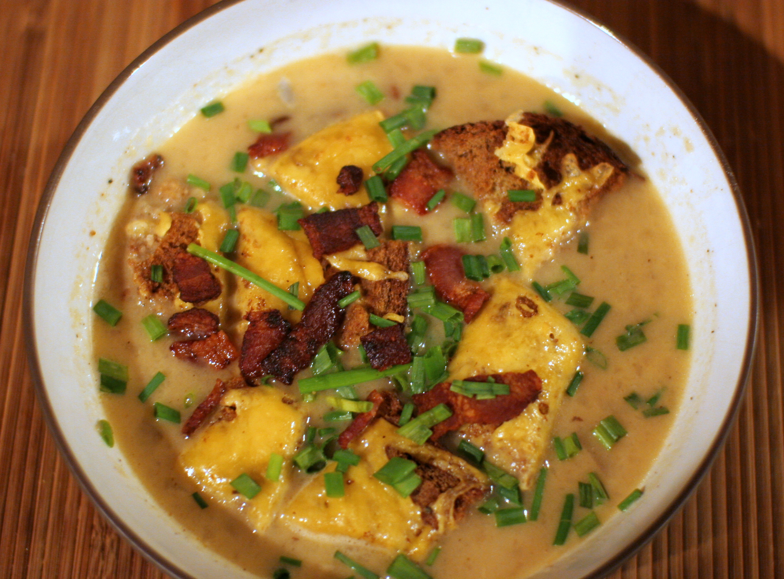 Ladle the soup into bowls and top with the bacon, chives, cheese croutons and more pepper.