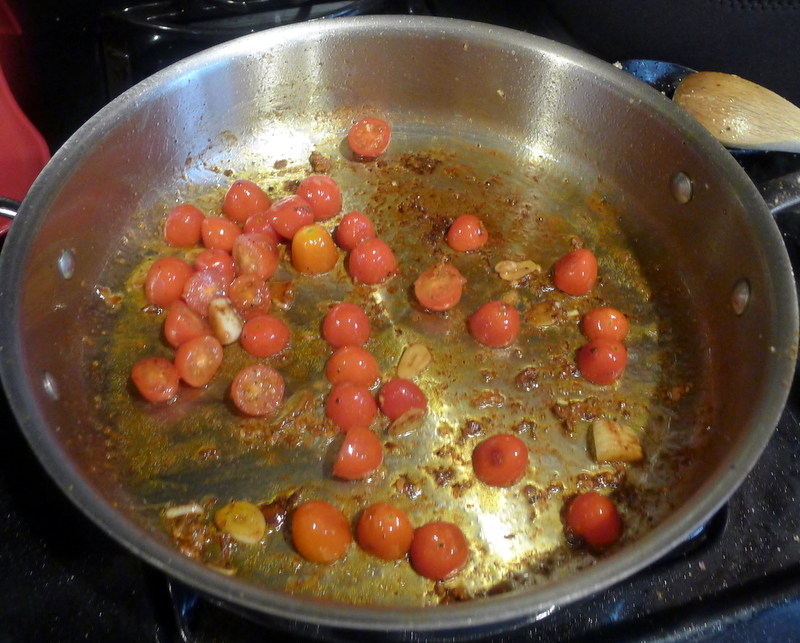 Heat the remaining 1 tablespoon olive oil in the skillet. Add the tomatoes, garlic and vinegar and cook until the tomatoes begin to soften, about 2 minutes. Sprinkle with salt.