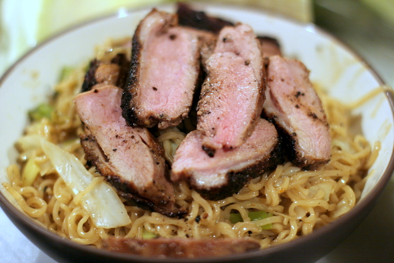 The Wagamama recipe is here if you want the full, glorious brothy experience. I only followed the recipe for the cooking of the duck; the noodle prep was exactly like the pork ramen recipe linked above (but with vegetable broth). Since I couldn’t find shichimi I used a whole lot of black pepper, toasted sesame seeds, and a chili seasoning I picked up from the Asian market instead. I’m calling this Duct Tape Duck Ramen since I cobbled together two recipes to improvise something yummy.