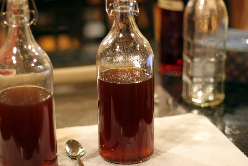 I’d also made the sugar syrup ages ago, and I made a huge quantity. Most of it crystallized over time, including one bottle that exploded all over our bar. That left a spectacularly sticky mess, we ended up getting rid of the old bar in a yard sale (my kitchen experiments are not always pretty, but that bar had served its time). But there was still enough left to sweeten these three batches of alchohol to perfection.