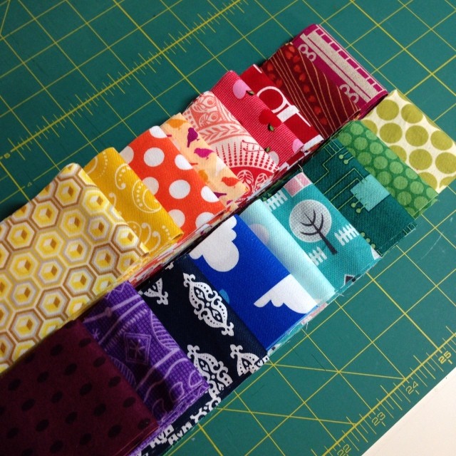 I picked 18 fabrics and cut up some 2.5″ strips out of each. For this design I really need two strips (selvedge to selvedge) in each color, but I used a lot of scraps in this project and needed to piece some smaller strips together. I cannot tell you how satisfying it was to use some of the scraps I’d just organized. Some of them have been languishing in bins, forgotten, for years.