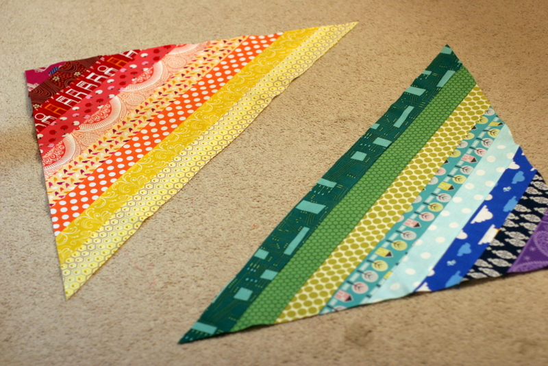 I’m working from opposite corners so that when I get all the colors together these pieces will meet in the middle. It’s a little less unruly then piecing the entire thing corner to corner, and I can lay the sections over each other to gauge how symmetrical they are.