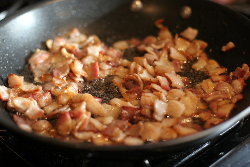 Preheat the broiler and position a rack 6 inches from the heat. In a 12-inch nonstick ovenproof skillet (**I don’t have a 12″ nonstick skillet, so I used my bigger skillet) cook the bacon over moderately high heat, stirring occasionally, until softened, 3 to 5 minutes.