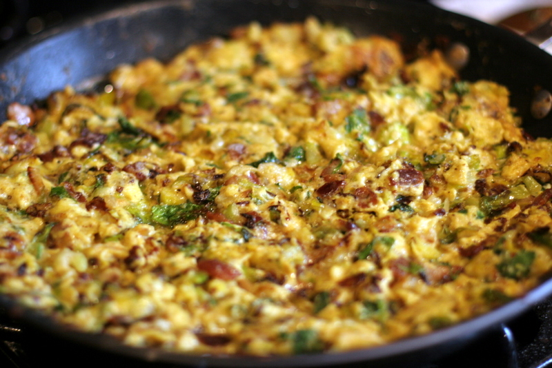 The sprout of Brussels definitely gets a bad rap, but it seems like it is the new hotness in ingredients. I see recipes for them everywhere, and clearly when they’re cooked correctly (read: not boiled to death), they are awesome. I made them for Christmas this year myself. And last weekend I used them in this scrumptious frittata recipe from Food & Wine. I didn’t have a small enough skillet, which is why my frittata is quite thin. But it was lick-your-fingers good, and it’s one of the best smelling things I’ve cooked in a while.