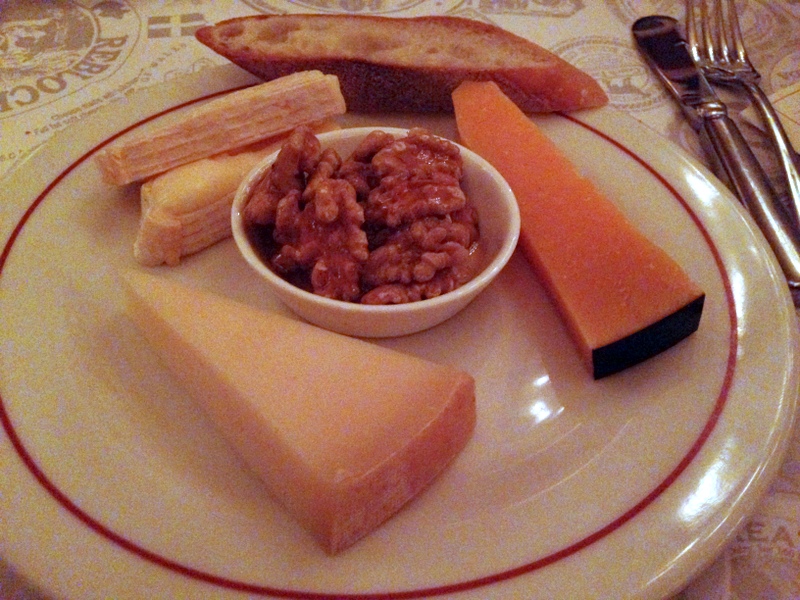 artisanalAnd there was so much cheese, but my photos of the night are terrible. I didn’t take nearly enough of friends, and the one shot I got of our amazing fondue appetizer is just indistinguishable. But, this was my dessert. It was amazing, even though the waiter swapped in some cheeses in place of what I asked for (availability?). Who cares, they were delicious! Honey walnuts with Pont-l’Évêque from France, Saenkanter from the Netherlands, and Ossau-Iraty from France. Heaven.