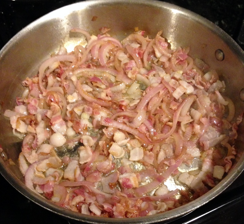 Meanwhile, heat 1 Tbsp. oil in a large skillet over medium heat. Add onion and pancetta and cook, stirring occasionally, until pancetta is brown and crisp, about 5 minutes; season with salt and pepper.