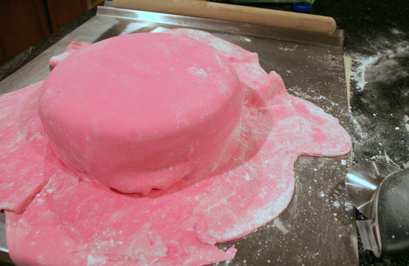 birthdaypinkcakeI am still terrible at fondant. And I don’t have any pictures of the finished cake yet, but I do think despite all the lumps and cracks it was still kind of adorable.