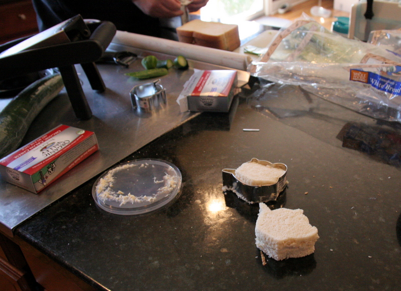 birthdaysandwichesWe made three kinds of tea sandwiches and cut them out with our own teapot cookie cutters. Chicken salad, PB&J, and cucumber with cream cheese. Adam helped a ton with sandwich prep the morning of the party, including an emergency run to the store for more supplies. So, of course, we had waaaay more food than we needed at the party. But I don’t like to underfeed people.