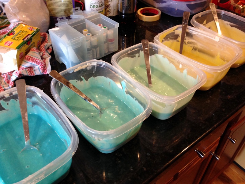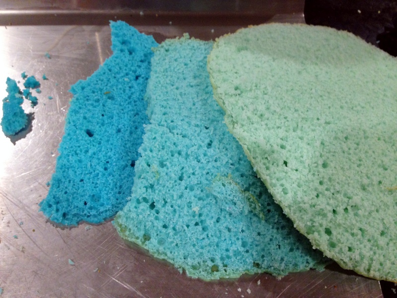 I made a two-tier cake; the top tier was 2 shades of yellow (which you could not see at all, note to self for the future). The bottom tier was 3 layers of blue, and that looked amazing.
