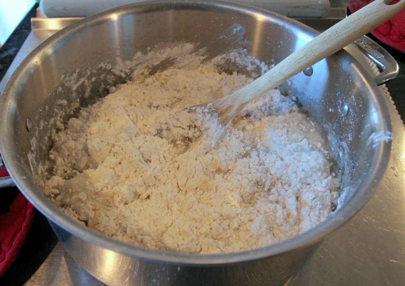 Combine water, oil, salt, cream of tartar in a saucepan and heat until warm. Okay, that’s what the recipe says to do, but truth be told I accidentally let this get to a boil. I think that worked in my favor, though, because rather than waiting for this to heat up enough to form a nice, non-sticky dough, I thoroughly cooked mine and just had to wait for it to cool down enough to knead by hand.