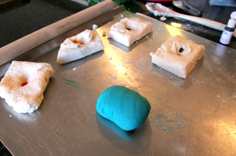playdough4I made a little well in each piece, added some drops of food coloring, and kneaded it until the color was thoroughly mixed in. This was another advantage of a hotter-than-warm dough; it really helped the color melt in everywhere. Look at that teal!