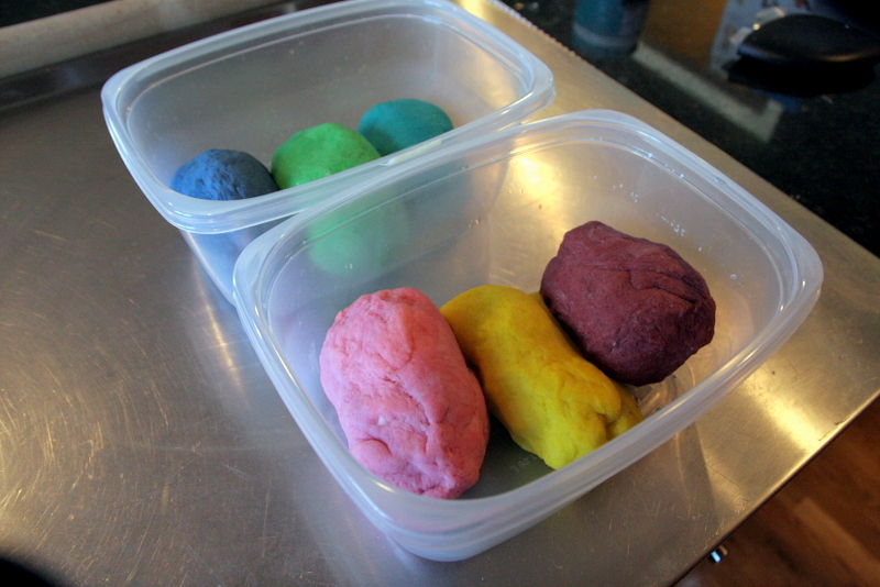 playdough3When I could touch it, it needed into perfect dough, which I portioned out into 6 pieces.