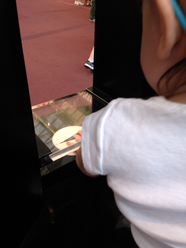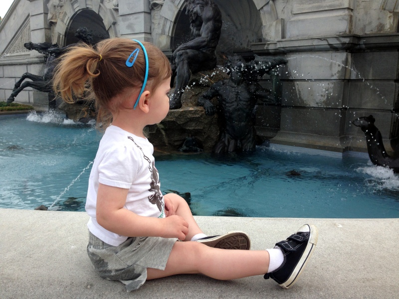 It was, truth be told, not quite the magical library experience I had planned. I forgot my camera in the car at the hotel, leaving me with just my phone. Getting through security with a toddler was entertaining; most museums had just checked my purse, but here I had to put all bags plus her stroller through the x-ray, and H had to walk by herself through the metal detector. She is two, and therefore this momentary glimpse of freedom meant she took off like a shot down the corridor. Once they let me pass through I had to chase her down, reassemble the stroller and bags, and by then I noticed that she was all wet. Not sure if it was because of a wet ledge in front of the fountains (in the photo a few up from here) or more nefarious reasons. But either way H needed an emergency change of clothes that I did not have (it was a very forgetful morning; I also left my beloved electric toothbrush behind in the hotel, lost forever). We had to stop in the gift shop to buy her a (completely awesome) emergency t-shirt/dress.