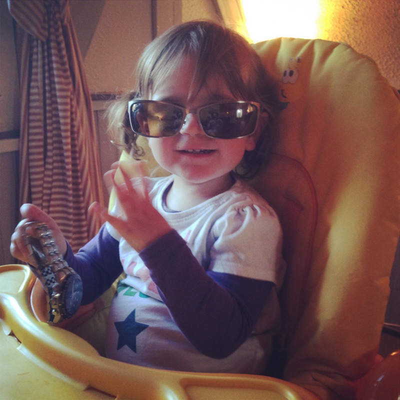 Also, H loves playing with her dad’s watch and wearing his sunglasses, and it was keeping her happy and quiet, so we let her have at it.